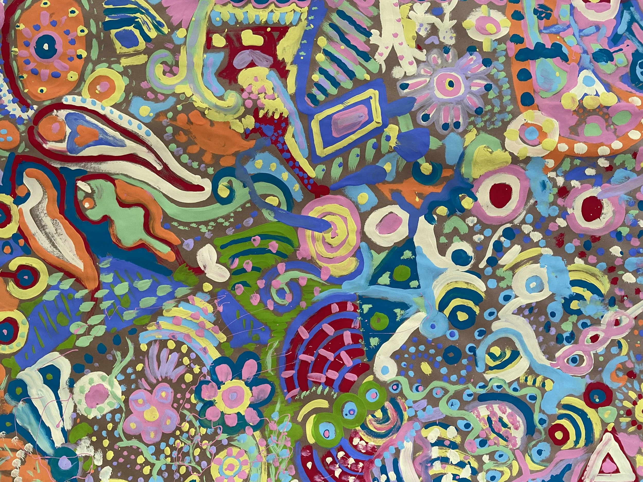 All the paintings are typically non-representational, evolving from shared ideas that emerge as we create together on the same canvas or paper. The purpose of this porous visual language is to leave art, and the reality to which it points, open to the experience and inclusion of the viewer. We trust that the viewer will continue the image and finish the thought with their own stories, questions, and imaginations.
